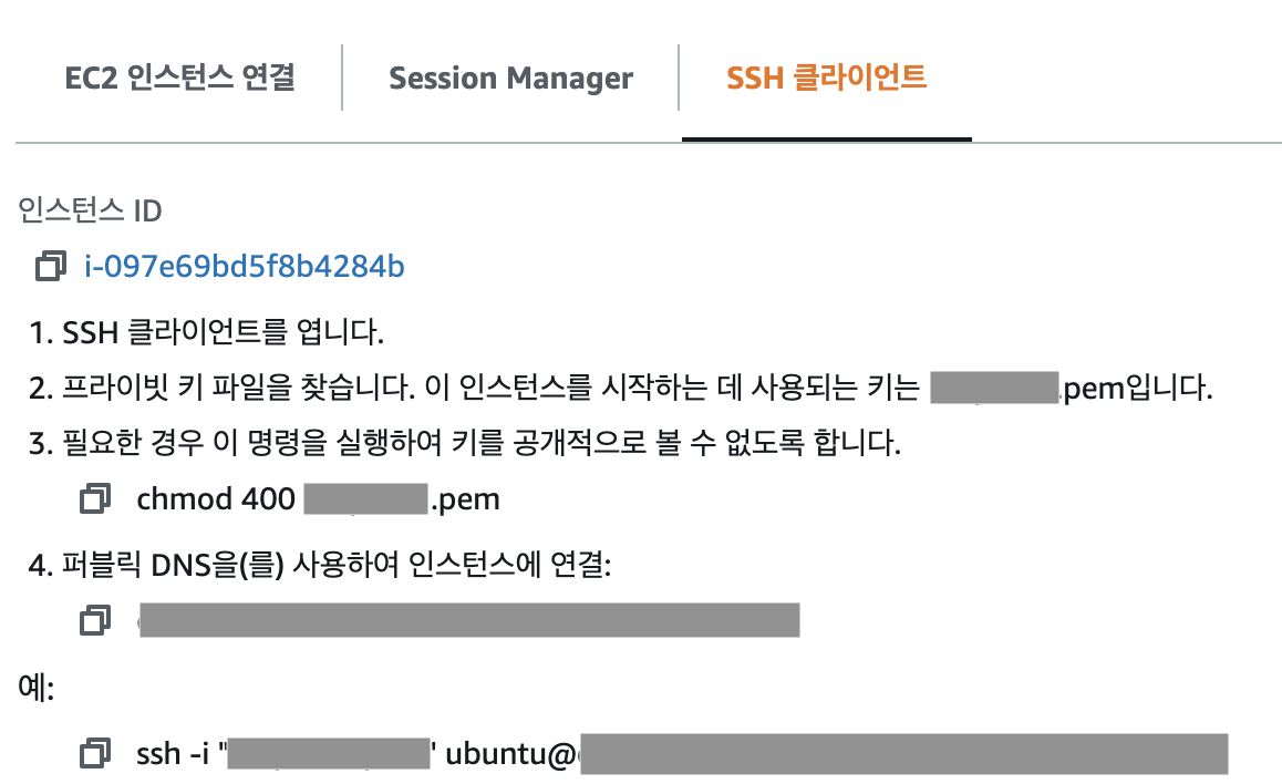 마지막 명령어를 복사해서 pem키 있는 위치에서 터미널을 키고 입력하면 쉽게 접속할 수 있다