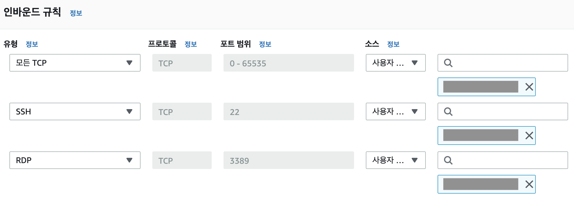 * 모든 TCP 유형 선택 - 소스 : 내 IP 추가