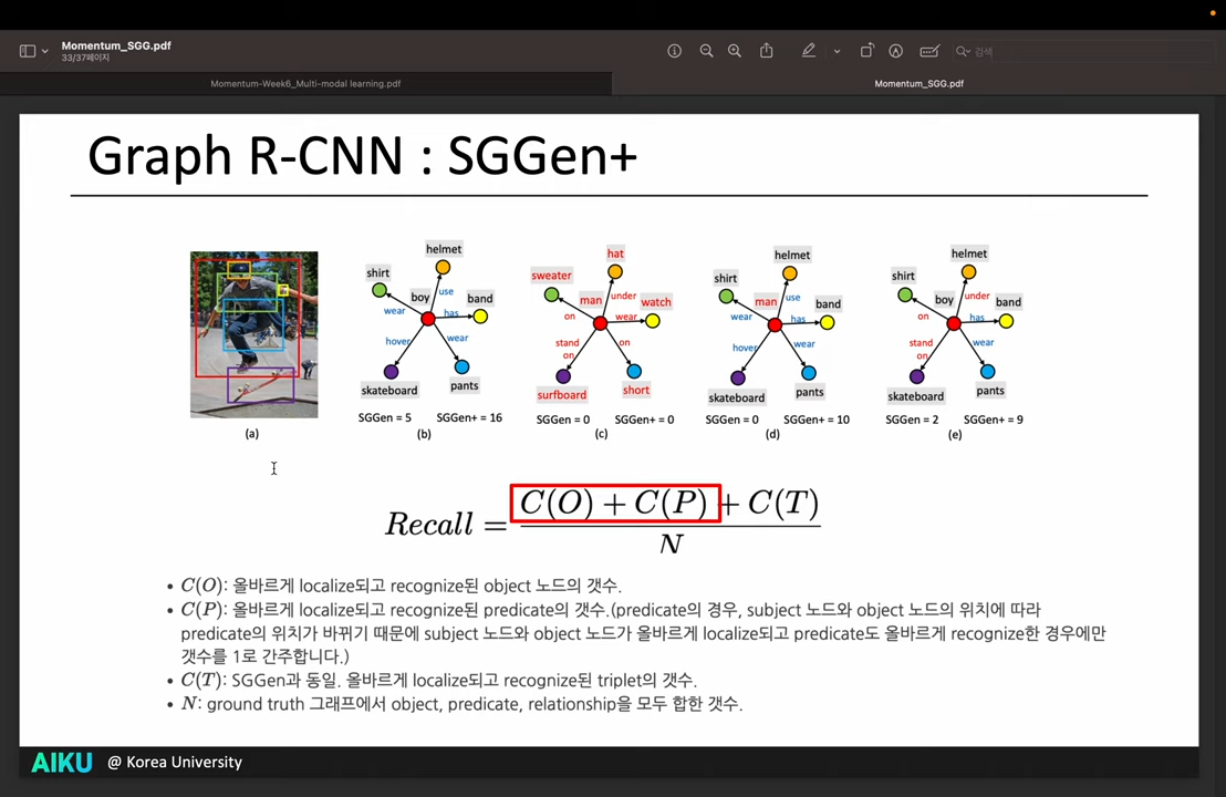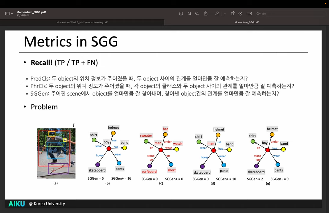 - 원래는 주로 SGGen을 사용 : 주어진 Scene에서 BBOX를 잘 그렸는지, Object 사이의 Relation을 잘 예측했는지