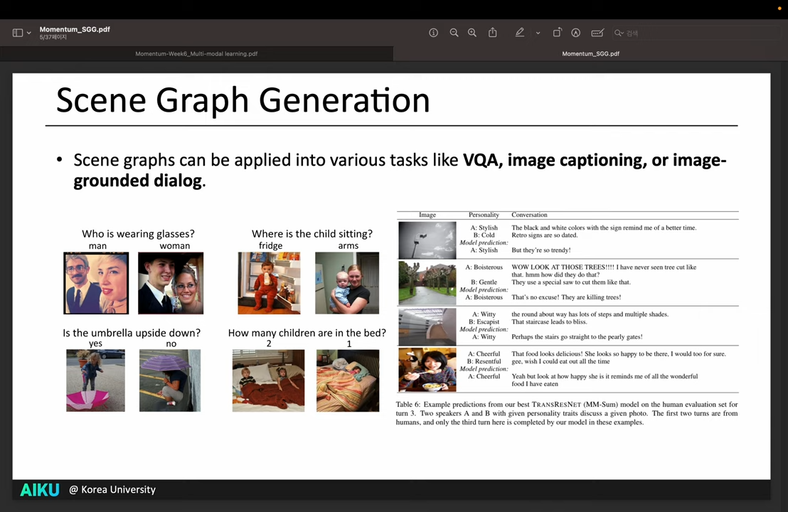 - Scene Graph로 Relation 정보를 모델링해서 VQA, Captioning, Image grounded dialog 등에 응용할 수 있음